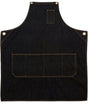 Cross back Denim Bib Apron with antique brass eyelets and studs, contrast denim stitching. Apron includes 4 front pockets and 2 top pen pockets.